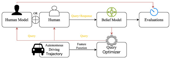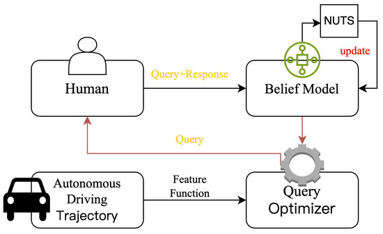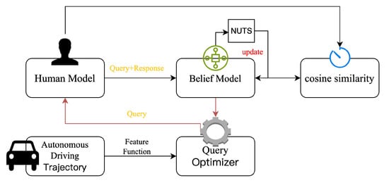 Our experimental setup within the CARLA environment involved training the optimal policy using the soft actor–critic (SAC) algorithm [18,19], focusing on the reward weights. We define the optimal strategy as the autonomous vehicle’s ability to navigate from a starting point to a final destination. Firstly, we generate trajectory queries based on empirical strategies, then develop preferences according to human intentions as shown in Figure 1, and subsequently construct a belief model based on those preferences. To refine the belief model as shown in Figure 2, we adopted the No-U-Turn Sampler (NUTS) [20] approach, thus eliminating the need for manual adjustments in the sampling step size and iteration count, as required by the traditional Markov chain Monte Carlo (MCMC) techniques [21,22,23], including the Metropolis–Hastings algorithm. The NUTS algorithm’s adaptive and self-tuning nature enhances user-friendliness and significantly reduces the influence of human-related variability in sampling efficiency. Furthermore, we conducted a comparative analysis, measuring the cosine similarity between the user and belief models. Our approach demonstrated a substantial performance improvement compared to conventional MCMC methods. Our investigation revealed that the APRL-formulated reward function significantly accelerates the policy learning process, facilitating the rapid attainment of optimal policies within a reduced temporal frame. This sophisticated reward function enhances the model’s adaptability to complex task environments. Remarkably, it also ensures higher success rates, even in tasks with stochastic initial and final positions.