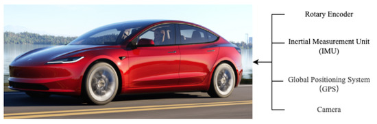 In line with established principles from prior research, our design approach for the simulation environment within CARLA is anchored in solid theoretical foundations. Our previous work constructed a specialized environment for autonomous vehicular navigation. This environment’s state space is primarily based on a forward-facing camera, capturing high-resolution, unprocessed images at 640 × 640 pixels. This method enables the autonomous vehicle to integrate inputs across various sources, creating a multimodal state space. Essential state vectors include the vehicle’s current velocity, displacement, acceleration, and the Euclidean distance to the endpoint. These vectors, such as velocity, position, and acceleration, are readily obtainable from onboard sensors, as depicted in Figure 4. Combining state vectors with the forward camera’s input shapes the multimodal state space. However, their significant memory requirements limit the use of high-quality original images [34] during training. We address this issue by employing variational autoencoders (VAEs) [35,36] to derive latent vectors, preserving the image features while reducing dimensionality and memory usage. These latent vector states are then integrated with the state vectors to create a cohesive multimodal state space.