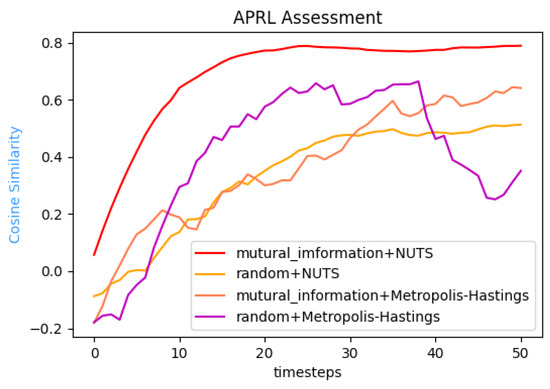 We conducted four experiments using distinct query optimizers and belief model updating methods. The mutual information optimizer and the NUTS (No-U-Turn Sampler) approach were applied in novel ways. Mutual information methods reduce the agent’s uncertainty by gleaning informative knowledge, resulting in simpler yet insightful questions that consider human response capabilities. The NUTS algorithm enhances the sample generation during belief model updates, obviating the need for parameter tuning and proving more efficient and user-friendly. Figure 6 demonstrates that our algorithm performs better than alternative methods, with stability analysis revealing the preference approach’s advantage. Our method tends to stabilize after approximately 20 iterations. While the mutual information approach also acquires queries effectively, the classic Metropolis–Hastings method achieves a relatively higher cosine similarity after several updates. The figure suggests that the orange curve is less smooth than the red, indicating that the competitor algorithm’s stability is inferior to ours. Based on this analysis, we selected the mutual information optimizer and NUTS to calculate the reward weights for active preference learning.