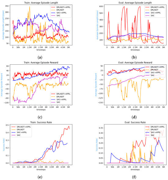 This figure presents the training (a,c,e) and evaluation (b,d,f) results of the four policies: DRLNDT + APRL, DRLNDT (Baseline), SAC + APRL, and Standard SAC. The policies are assessed based on their , , . The x-axis represents the timestep, while the y-axis corresponds to the , , and , respectively.