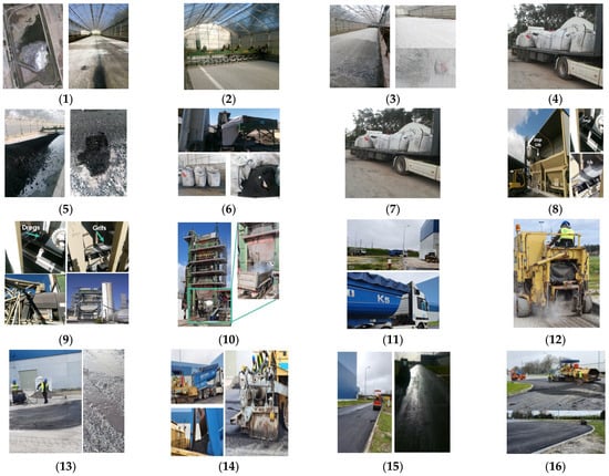 Implementation steps of bituminous mixtures with and without wastes (dregs and grits) on a road surface: 1. Waste transportation from producer (NVG) to waste manager (WM) in an open truck; 2. Drying process at solar drying (greenhouse); 3. Grits drying process; 4. Grits transportation to the bituminous central; 5. Dregs drying; 6. Dregs sieving process after drying; 7. Dregs transportation to the bituminous central; 8. Mixing dregs and grits in the bituminous mixtures; 9. Bituminous mixtures production; 10. Discharge of bituminous mixture to the truck; 11. Bituminous mixture truck arriving at road location; 12. Surface treatment for roughness; 13. Track coat asphalt emulsion application; 14. Mixtures application equipment; 15. Dregs bituminous mixture application; 16. Grits bituminous mixture application; 17. Standard (reference) bituminous mixture application; 18. Final road stretches (reference, dregs, and grits).