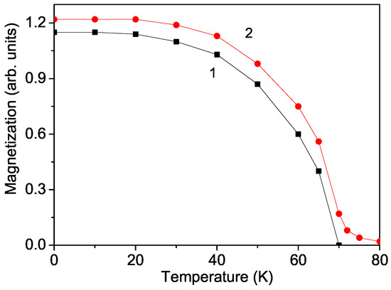 Initially, we undertake an analysis of the temperature-dependent behavior of the magnetization, M, along the b-axis, utilizing Equation (5) from the CBCO framework. The resulting depiction, as illustrated in Figure 2, is found to be consistent with empirical observations from various experimental sources [3,6,9,17,18]. Notably, a pronounced reduction is observed around the critical temperature () = 70 K, aligning with theoretical expectations (denoted as curve 1). Furthermore, the magnetization values at lower temperatures provide compelling evidence supporting the presence of charge ordering among the Co ions. Upon the application of an external magnetic field, h, both the magnetization, M, and the critical temperature () demonstrate an increase (denoted as curve 2), thereby elucidating the influence of external perturbations on the magnetic properties of the system. The magnetic field, h, tries to arrange the spins in its direction. Thus, it increases those that are parallel to its direction or rotates those that are in the opposite direction. The final effect is an increase in the magnetization, M. When the external magnetic field, h, is absent, there is a second-order phase transition in the system, and the magnetization, M, vanishes at the critical magnetic phase transition temperature because there is a discontinuity in the magnetic susceptibility vs. temperature T (not shown here). When the external magnetic field, h, is non-zero, the magnetic susceptibility vs. T is now continuous. The phase transition is broader.