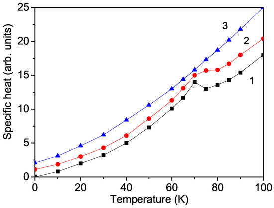 In the context of Figure 3, curve 1 depicts the specific heat of CBCO as a function of temperature T for zero magnetic field, h = 0, determined through the derivative , where H represents the comprehensive Hamiltonian. Notably, a discernible anomaly appears in the curve near the critical temperature () = 70 K, a phenomenon consistently observed in studies by Caignaert et al. [3], Oda et al. [18], and Iwamoto et al. [6]. Upon the imposition of an external magnetic field, h, the specific heat, , increases. Moreover, for weak magnetic fields, the peak becomes smaller, wider, and shifts to higher temperature values, whereas for strong magnetic fields, it disappears, as depicted in Figure 3, curves 2 and 3.