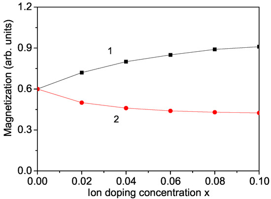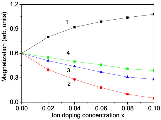 The influence of the doping concentration is quantified through the factors () and x in the first two terms of Equation (1), respectively. Here, x represents the doping concentration, wherein the exchange interaction constant J progressively diminishes from its maximal value in the absence of doping (x = 0) to the exchange interaction constant in the scenario where all host ions are replaced by dopants (x = 1).