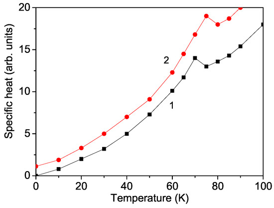 Temperature dependence of the specific heat of CBCO for different Fe dopant concentrations x: (1) x = 0, (2) 0.1.