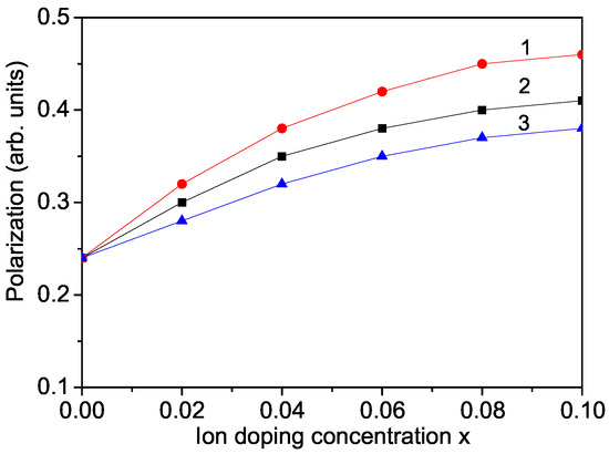 Dependence of the polarization on the dopant concentration x of CBCO for T = 60 K for different doping ions: (1) Ni, (2) Mn, (3) Zn.