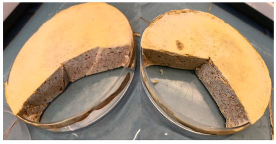 In this experiment, oncom was obtained from stale bread using a cultivation method previously developed. Co-fermentation products were prepared using a standard procedure, except that at the inoculation stage, P. freudenreichii cells were additionally introduced into the substrate. It should be noted that the oncom obtained by co-fermentation did not differ in appearance, smell, or taste from the control oncom. While a sensory test was not conducted, the above observations were made by individuals conducting this experiment and familiar with the typical characteristics of the bread-based oncom produced in the unit’s laboratory. Figure 1 shows the appearance of a typical oncom from mixed bread after fermentation on a Petri dish.