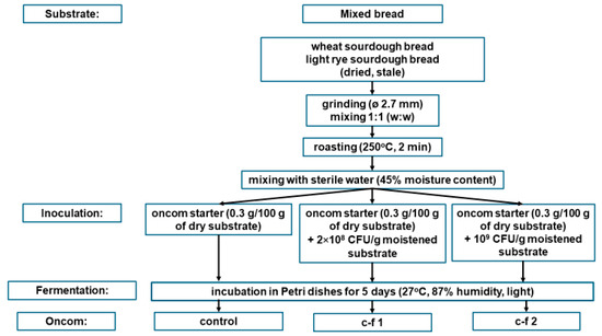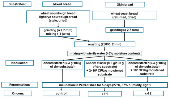 As fermentation substrate, the following breads were used: stale sourdough wheat bread and stale light rye sourdough bread, dried at 70 °C (from the artisan bakery Handelek, Kraków, Poland), and dried returned wheat yeast Okin bread, specifically the Big Gourmet (from the industrial bakery Artadi Alimentación S.L, Zumaia, Spain), kindly provided by Rebread Upcycled Food sp. z o.o. (Kraków, Poland).