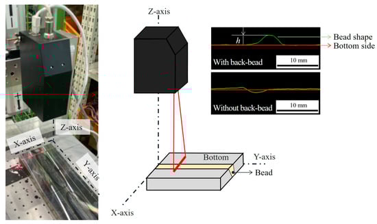 Figure 3 illustrates the method used to measure the penetration condition, which is utilized as output data. A laser vision sensor was used to scan the bottom side of the welded specimens. Based on the scanned results, the classes were categorized. The height (h) of the weld bead on the underside of the completed weld specimens was measured using a developed laser vision sensor to obtain the output data. A laser vision sensor with a resolution of 0.02 mm along the X- and Z-axes was utilized. Considering the integrity of the back-bead, h values equal to or greater than 0.2 mm were classified as CJP. The laser sensor was moved along the Y-axis at a speed of 7 mm/s, and h was measured 100 times/s. h values below 0.2 mm were classified as class 0 (PJP), h values equal to or above 0.2 mm were classified as class 1 (CJP), and burn-through instances were classified as class 2. These classes were used as the output data.