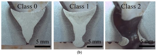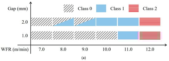 Figure 4 depicts a schematic of the changes in the state of the back-bead with respect to variations in the WFR and root gap. At a 1.0-mm gap, PJP (class 0) occurred with WFRs ranging from 7.0 to 1.0 m/min, while a CJP (class 1) was achieved at a WFR of 11.0 m/min. At a WFR of 12.0 m/min, burn-through (class 2) occurred without back-bead formation. At a 2.0 mm gap, PJP (class 0) occurred at a WFR of 7.0 m/min. In addition, for WFR values ranging from 8.0 to 9.0 m/min, a mixture of PJP (class 0) and CJP (class 1) was observed. For WFR values ranging from 10.0 to 11.0 m/min, CJP (class 1) was achieved. However, for a WFR of 12.0 m/min, burn-through (class 2) occurred (Figure 4a). Figure 4b shows the cross-sectional shape of the weld joint when PJP, CJP, and burn-through occurred.