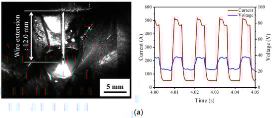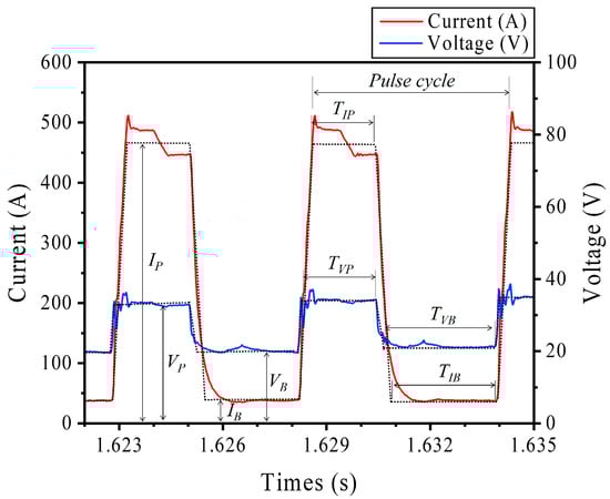 Figure 5 illustrates the current and voltage waveforms during welding performed using a DC pulse. The current and voltage waveforms were analyzed to assess the validity of structuring the input data before their composition. The average welding current/voltage and pulse cycle were verified. The average peak current (IP), average base current (IB), duration of the peak current (TIP), and duration of the base current (TIB) were determined from the current waveform. The average peak voltage (VP), average base voltage (VB), duration of the peak voltage (TVP), and duration of the base voltage (TVB) were determined from the voltage waveform.