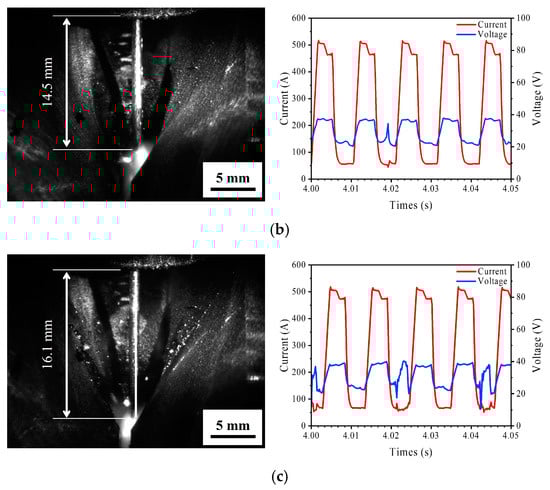 Welding phenomena images and current/voltage corresponding to varying forms of penetration: (a) PJP (class 1); (b) CJP (class 2); and (c) burn-through (class 3).