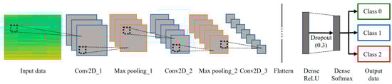 A CNN model was developed to predict the penetration conditions by converting the welding current/voltage into dynamic resistance. Figure 8 and Table 3 depict the model for predicting the penetration condition classification from the dynamic resistance transformed using the STFT. We obtained a random set of 2000 data points, which was divided into a training set of 60% (1200 points), a validation set of 20% (400 points), and a test set of 20% (400 points). The classified dynamic resistance information in the STFT was utilized as the input variable for the operations. The CNN model comprises three convolutional layers and two pooling layers. In the convolutional layers, a kernel size of 3 × 3 pixels and a stride of 1 pixel were selected. The kernel size has to be selected to balance computational efficiency and feature extraction capabilities. Smaller kernels reduce the number of network parameters, lowering computational load and mitigating the risk of overfitting. We determined that a 3 × 3-pixel kernel size is optimal for the model through preliminary testing and evaluation based on prediction accuracy. ReLU and Softmax activation functions were used, and dropout was applied to some parts of the CNN at a rate of 30% to prevent overfitting between the two functions; the CNN model was trained for 50 epochs. Adam was used as the function for model optimization, whereas cross-entropy was employed as the loss function to obtain the difference between the predicted and actual values. Finally, the performance of the model was evaluated using accuracy as a metric to assess its performance.