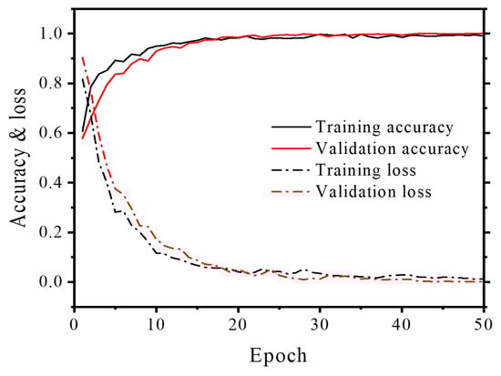 After conducting classification training with 2000 randomly extracted penetration condition data points, the accuracy and loss of the training data were 0.9593 and 0.1036, respectively. The accuracy and loss of the validation data are 0.9516 and 0.1140, respectively. Figure 9 illustrates the training process for the training and validation datasets. The accuracy showed an increasing trend as the training progressed, converging closer to 1. Moreover, the loss gradually converged toward zero as the number of training iterations increased, indicating that the model did not overfit.