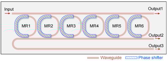 The designed programmable silicon photonic filter consists of a 6-stage parallel cascaded MR with different radii. Each MR is coupled to adjacent ones to increase the diversity of the optical paths within the device. By employing different radii of the MRs, the Vernier effect is introduced, which further enhances the diversity of the filter’s transmission spectrum, thereby improving the sampling efficiency of the filter.