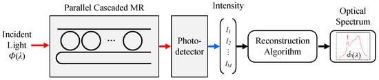Innovative designs have emerged, replacing traditional diffraction-based elements with novel dispersive ones, such as disordered scattering media [,,,], metasurfaces [,], photonic crystals [,], quantum dot arrays [,], multimode waveguides [,], or filter arrays [,,,]. These approaches utilize these novel dispersive elements to create a sampling array, capturing the incident spectrum across multiple channels. The reconstruction of the spectrum is based on the speckle or intensity distribution obtained from these samplings. However, the scalability of the sampling array can limit the resolution and accuracy of the reconstruction. Another design approach employs dynamically tunable elements, such as tunable cavities [], black phosphorus detectors [], perovskite detectors [], and reconfigurable silicon photonic networks [,]. By applying external control signals, the response function of the tunable sampling unit can be dynamically adjusted to achieve variable sampling of the incident spectrum. The challenge for these systems is to achieve accurate and high-resolution spectral reconstruction while avoiding overly complex device architectures or numerous sampling channels.