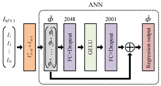 where the sampling matrix TM×N connects the intensity vector IM×1 with the incident light ΦN×1 to be measured. Clearly, there are M equations and N unknowns Φ(λk) to solve for in Equation (3). The unknown input spectrum ΦN×1 can be computed by multiplying the output intensity IM×1 by the inverse of the matrix TM×N. In general, since the inverse matrix is only applicable to square matrices, the number of recoverable wavelength channels is limited by the number of sampling channels. However, with proper design, the number of samples M required to reconstruct the spectrum of input light can be much smaller than the number of spectral pixels N []. When M is less than N, the problem described by Equation (3) is underdetermined. Reconstruction algorithms such as compressed sensing and convex optimization can be applied to solve this underdetermined problem and recover a high-resolution incident light spectrum [,]. In our work, we designed an ANN model based on residual blocks, referring to the algorithm in the literature [], to complete the task of reconstructing the incident light spectrum. Additionally, we have modified the model architecture to reduce computational complexity and resource requirements. Specifically, we have replaced the multiple convolutional layers with a single fully connected layer while retaining residual connections. This modification streamlines the model architecture, making it more efficient and less resource-intensive, without compromising its performance in reconstructing the incident spectrum from the sampled signals. Compared to traditional methods, the spectrum reconstruction algorithm based on deep learning does not rely on prior knowledge of the incident spectrum and offers faster solving speed [].