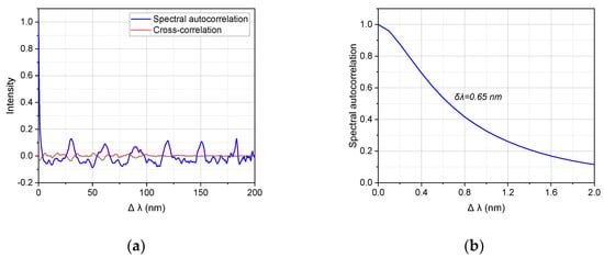 Using the Ansys Lumerical INTERCONNECT simulation platform, we set two operational states for each of the six phase shifters, introducing phase shifts Δφ of 0 and , resulting in a total of 64 sampling states. By considering the 3 output ports of the filters, we ultimately acquire 192 sampling channels from the filters, forming the sampling matrix. Figure 4a shows the heatmap of the sampling matrix of the designed spectrometer based on the programmable filter. Figure 4b displays the transmission spectra of the filter under four different phase-change conditions, which are randomly selected. Each row in the heatmap represents the transmission spectrum of a sampling channel. Autocorrelation and cross-correlation function to characterize the filter’s transmission spectra [,]. The half width at half maximum (HWHM) of the auto-correlation function, denoted as δλ, is a crucial parameter that quantifies the spectral resolution of the reconstructive spectrometer. It represents the minimum wavelength shift required to reduce the correlation between individual sampling channels by 50%. In other words, δλ determines the ability of the system to distinguish between neighboring wavelength pixels. The cross-correlation between two distinct sampling channels is a measure of their similarity in the spectral domain. It quantifies the extent to which the spectral responses of the two channels are correlated with each other. In an ideal scenario, the sampling channels should be orthogonal, meaning that they are completely independent. When this condition is satisfied, the cross-correlation between any two distinct sampling channels should be zero at all wavelength points. By assessing the autocorrelation and cross-correlations of the sampling matrix, we can evaluate the effectiveness of our sampling system in providing diverse and complementary spectral information. The calculated autocorrelation and cross-correlation are shown in Figure 5. The narrow autocorrelation with δλ = 0.65 nm and low cross-correlation indicates a well-designed sampling matrix contains diverse features with very little cross-correlation signal. The incident light spectrum can be converted into a unique intensity vector after sampling and detection, allowing the subsequent reconstruction algorithm to work effectively.