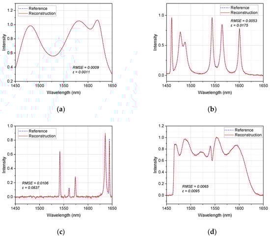 Figure 6a,b illustrates the reconstruction of a spectrum with relatively wide peaks, where the FWHM of each peak is randomly selected from the interval (2 nm, 100 nm) and (2 nm, 10 nm). The reconstructed spectrum closely matches the true spectrum, with an RMSE of 0.0009 and 0.0053 and ε of 0.0011 and 0.0175, respectively. In Figure 6c, we demonstrate the reconstruction of a sparse spectrum with several narrow peaks, where the FWHM of each peak is randomly chosen from the interval (1 nm, 2 nm). Despite the presence of sharp and closely spaced peaks, the reconstructed spectrum still accurately captures the key features of the true spectrum, achieving an RMSE of 0.0106 and a relative error ε of 0.0837. From the figures, it is evident that the peaks in the synthesized spectra are precisely reconstructed. We also performed reconstruction on the measured spectra of an amplified spontaneous emission (ASE) light source, with the results shown in Figure 6d. The spectral range of the ASE light source is inherently 1500 nm to 1600 nm, originally containing 1001 data points. To facilitate the verification of our chip’s ability to reconstruct measured spectra, we expanded it to 2001 data points through interpolation, assuming a wavelength range of 1450 nm to 1650 nm. The RMSE and the relative errors ε are 0.0065 and 0.0095, respectively. These results demonstrate that our designed on-chip spectrometer is capable of accurately reconstructing real-world spectra. The low RMSE and relative error values for both the synthesized and measured spectra indicate the robustness and effectiveness of our on-chip spectrometer design and the associated ANN-based reconstruction model. The model’s ability to handle diverse spectral features, including narrow and closely spaced peaks, highlights its potential for practical applications in various fields where accurate spectral reconstruction is crucial.