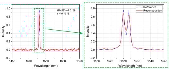 The ability to resolve closely spaced narrow peaks is crucial for many spectroscopic applications, such as gas sensing, environmental monitoring, and chemical analysis. In these fields, the spectral features of interest often lie in a narrow wavelength range, and the ability to distinguish between adjacent peaks is essential for the accurate identification and quantification of the target analytes. To further demonstrate the spectral resolution of the proposed spectral chip, we simulated the reconstruction of a dual-peak spectrum, where the peaks are separated by 2 nm, and each peak has an FWHM of approximately 1 nm. The reconstruction results are shown in Figure 7, with an RMSE of 0.0169 and a relative error ε of 0.1918, providing strong evidence for the high spectral resolution of our proposed on-chip spectrometer. The two narrow peaks spaced at 2 nm are clearly distinguishable in the reconstructed spectrum, indicating that the spectral reconstruction resolution of our designed spectrometer chip can reach 2 nm under a limited number of sampling channels. The clear resolution of the two peaks demonstrates the capability of our design to resolve fine spectral features, which is a key performance metric for advanced spectroscopic devices.