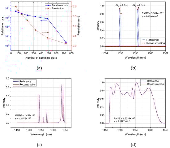 (a) The calculated average relative error ε on test set and the resolution of reconstructed spectrum using the spectrometer designs with different sampling state numbers. Simulated reconstruction results with 729 sampling states for (b) narrow double-peak spectra separated by 0.1 nm and 0.2 nm, (c) previously selected narrow spectrum, and (d) the measured ASE spectrum.