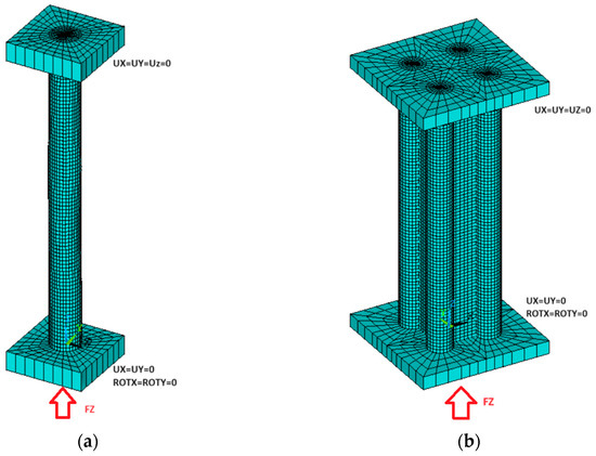 To achieve a more realistic simulation of the boundary conditions of the columns, upper and bottom end plates with a thickness of 50 mm were included in the model. In both cases, the upper plate was fixed, and the force Fz was applied to the moving bottom plate. The boundary conditions are depicted in Figure 3, following the main experimental setup used by Farmani et al. [11,12].