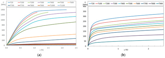 The properties of the UHSS tubes at ambient temperature are defined according to Table 2, while the properties of the SS plates are determined from Table 3. Using the reduction factors and nonlinear coefficients provided in [11] and [12], the stress–strain curves used for the constitutive model were generated for various temperatures, as depicted in Figure 4. Regarding the upper and bottom plates, only an elastic behaviour was considered, with an elastic modulus of 2000 GPa to simulate a rigid material.
