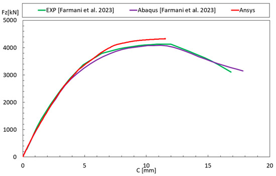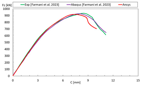 After conducting the GMNIA analysis at room temperature, it became possible to compare the results obtained in Ansys with the experimental and numerical results presented by Farmani et al. [11], as illustrated in Figure 6. In this graph, C corresponds to the axial displacement at the central node of the bottom plate (contraction). The comparison shows that the simulation performed in Ansys exhibited good agreement with the compared results, displaying only a minor difference in its final curve region. The maximum force obtained was 917.91 kN, representing a relative error of −1.93% compared to the experimental result.