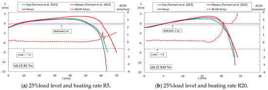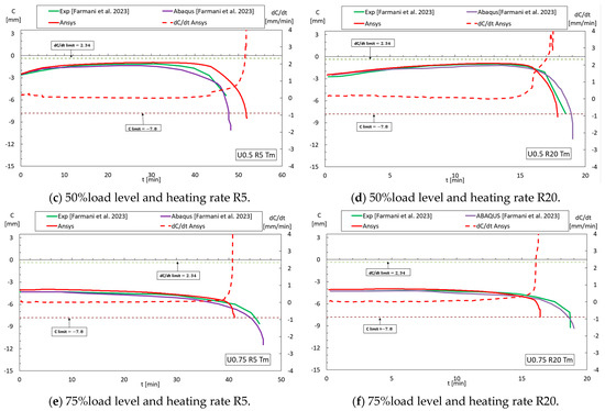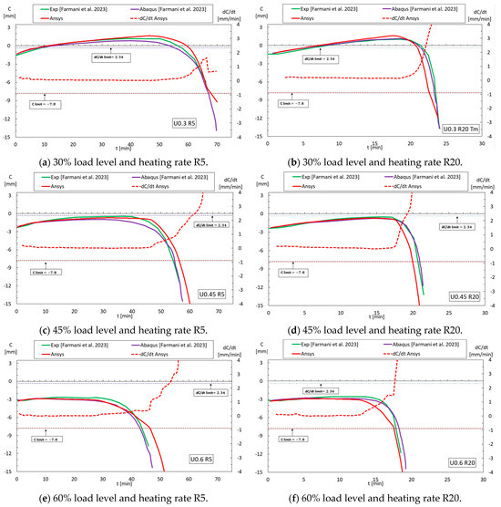 Figure 7a illustrates the test results with a heating rate of 5 °C/min, with a constant mechanical load corresponding to 25% of the load-bearing capacity. Figure 7a represents the displacement over time. The Ansys results for axial displacement (C) agree with the experimental tests up to the first 30 min, diverging slightly thereafter. The evolution of the displacement rate (dC/dt) is also represented. It is important to note that Farmani et al. [11] did not mention the displacement rate criterion. Figure 7b presents the results obtained with a heating rate of 20 °C/min using the same mechanical load (25%). Notably, the differences in axial displacement are much smaller in this case, indicating a higher level of agreement between the Ansys results and the experimental data. The accuracy of the approximation will be presented by the Root Mean Square Error (RMSE) and the relative error.