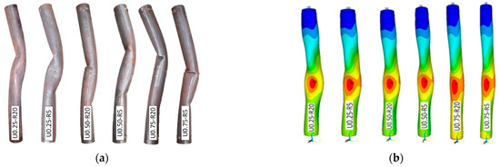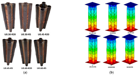 It was also possible to compare the experimental failure modes with those obtained by Ansys, as demonstrated in Figure 8. The difference in local buckling may be explained by the singular local imperfection existing in each specimen.