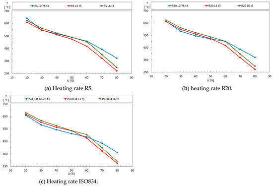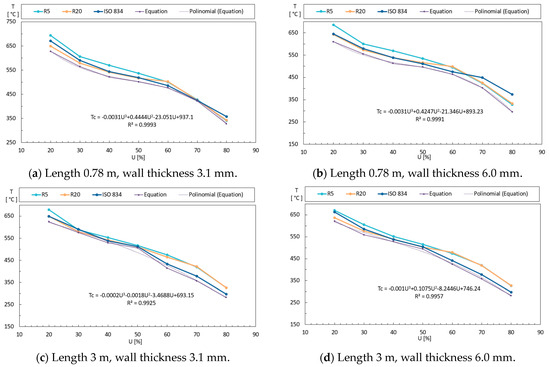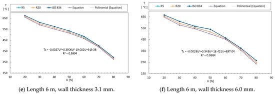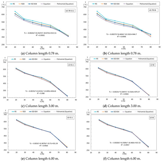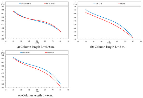 The design curve can be seen in Figure 13, which represents the critical temperature variation with the load level (U) for CHS columns. Figure 13a presents a CHS element with a length of 0.78 m and a thickness of 3.1 mm, while Figure 13b depicts a CHS with the same length but a thickness of 6 mm. Figure 13c,d present the results for the CHS columns with 3 m with thicknesses of 3.1 mm and 6 mm, respectively. Finally, Figure 13e,f depict CHS, using the same thickness values, respectively.