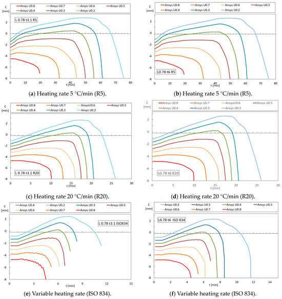 Figure 14a,c,e correspond to CHS columns with a length of 0.78 m and a thickness of 3.1 mm, with heating rates R5, R20, and ISO 834, respectively. On the other hand, Figure 14b,d,f represent CHS columns with the same length of 0.78 m but a thickness of 6 mm, also with different heating rates R5, R20, and ISO 834, respectively. As shown in Figure 13 and Figure 14, an increase in the load level significantly decreases the critical temperature and the fire resistance time of the column. Furthermore, it is noted that the variation in critical temperature is greater for small and large load levels. It is also noted that the fire resistance time decreases with the heating rate.