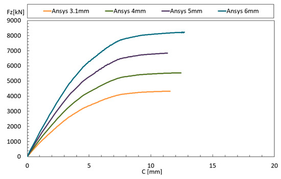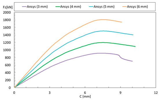 Before conducting the GMNIA analyses at elevated temperatures, it was necessary to perform analyses at room temperature to determine the maximum load-bearing capacity for different thicknesses. The results obtained at room temperature are depicted in Figure 15. Initially, analyses were conducted for four different thicknesses; however, it was decided to focus only on thicknesses of 3.1 mm and 6 mm in the subsequent parametric analysis.