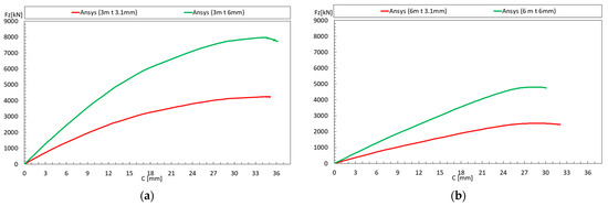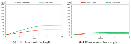 For the parametric analysis involving column length, it was necessary to modify the mesh and reintroduce imperfections. Therefore, for the longer columns, the number of divisions in the direction of their length was increased. The columns with a length of 3 m were divided into 150 elements along their length, resulting in 5440 elements, while the column with a length of 6 m was divided into 300 elements, resulting in 10,240 elements. As for imperfections for these longer lengths, only the global imperfection was used. Moreover, simulations at room temperature were developed, as shown in Figure 16. These simulations were developed to determine the load-bearing capacity; in Figure 16a, the results are presented for CHS columns with length of 3 m, and in Figure 16b, the results are presented for CHS columns with 6m length.