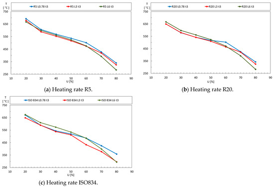 Anyway, the critical temperature under load changes from 402 °C (for CHC with U75R20, with 14 min of fire resistance) to 650 °C (for CHC with U25R5, with 69 min of fire resistance). If one increases the heating rate submitting the CHC columns to a hydrocarbon fire, these columns will reach almost the same critical temperature but cannot achieve the minimum fire rating of 15 min. This means that these columns under very high heating rates require external insulation to reach the minimum fire rating specified in Europe [16].