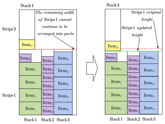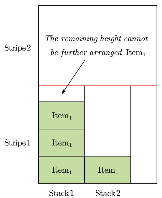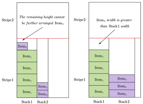 - As shown in Figure 5, if all parts of are arranged without exceeding the height of Stack1, will be placed there. First, it is determined whether the width of is greater than the width of Stack1. If the width of is not greater than the width of Stack1, then will be placed in Stack1. Similarly, when the remaining height of Stack1 cannot accommodate , then will be placed in the next stack, Stack2, and the width of Stack2 is the width of . If the width of is greater than the width of Stack1, then is arranged in Stack2, and the width of Stack2 is the width of .
