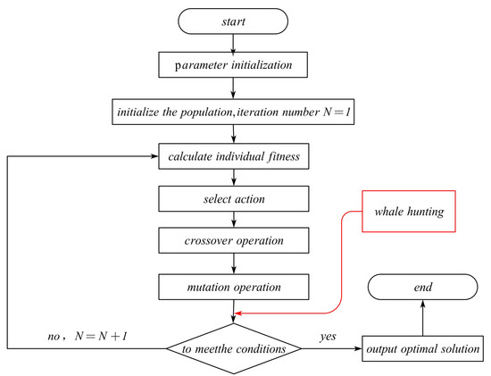 The genetic whale algorithm proposed in this article combines the genetic algorithm with the whale optimization algorithm. Its fundamental principle is utilizing the genetic algorithm (GA) as the outer loop and integrating the whale optimization algorithm (WOA) into the GA. This design aims to make full use of the global search capability of the GA and the local search capability of the WOA to avoid falling into the local optimal solution during the search process. This enables the genetic whale algorithm to more effectively uncover the optimal solution on a global scale and to fully exploit the global search capabilities of the GA. During the entire algorithm operation, the GA not only dominates the outer loop but also incorporates the WOA, so the two work together to significantly improve the efficiency of the final solution. Therefore, the genetic whale algorithm is initiated from a randomly generated or a customized initial population. In each cycle, the individuals of the population are selected and crossed, the whale hunting process is then added, and finally, the mutation process is performed; the above is then repeated. A fixed number of iterations is used while monitoring the convergence of the objective function and the diversity of the population. The loop is terminated when any condition is met to obtain the optimal solution. The basic steps of the genetic whale algorithm are shown in Figure 7.