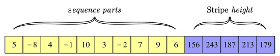 In this algorithm, the quality of the initial population directly affects its search performance. The initial population should have a certain diversity and should also meet the constraints of the problem. On the basis of conventional layout constraints, as shown in Figure 8, this study introduced “stripe” as a height-limiting factor, employing a random generation method. In the population initialization stage, the stripe height is randomly generated after the part sequence is randomly generated. The stripe height is determined using a random generation range based on the size of the parts and the width of the plate in the actual problem. The sequence of parts and the height of the stripe together form an individual. The number of stripes should be slightly larger to ensure that all parts can be arranged. As shown in Figure 8, the numerical values in the sequence of previously placed parts represent the part numbers. A positive value indicates that the part’s rotation angle is 0°, while a negative value indicates that the part’s rotation angle is 90°. The numerical values in the sequence of stripe heights represent the heights of each stripe.