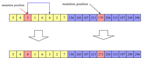 The two-point crossover method was selected here. Two crossover points are selected based on the crossover probability. The crossover points of the two parent chromosomes are the same, and the genes at the two crossover points of the two parent chromosomes are swapped. When the number of parts is N and the crossover probability is P (), an integer a is randomly generated as the first intersection point , and the other intersection point b is . Since the nodes of the chromosomes in this article represent the order in which the parts are arranged, the sequence numbers of the two nodes cannot be the same, so during the crossover process, each sequence number needs to be exchanged according to the corresponding position of the other chromosome. Only the stripe heights at the intersection points need to be exchanged in the individual during the crossover stage. This process is illustrated in Figure 9, where parts in the input sequence are swapped according to the blue arrows, exchanging the positions of part numbers. The heights in the stripe height sequence are swapped at the crossover positions.