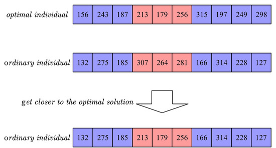 In the whale hunting stage, some ordinary individuals need to be moved closer to the optimal individuals, and some positions of ordinary individuals need to be changed into the corresponding positions of the optimal individuals, as shown in Figure 11.