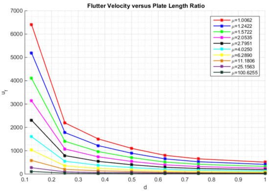 Equation (54) gives the flutter velocity in Figure 6 within 1 percent for and . To give an example, for aluminum (with a density , elasticity modulus GPa, Poisson’s ratio ) plate of thickness 5 mm for m and m, (54) gave the non-dimensional flutter velocity as 91.7847 (91.166737 with the collocation method) and the actual flutter velocity was 704.5209 m/s (699.7770 m/s with the collocation method). With the use of (54), design engineers can easily and rapidly predict the flutter velocity. This is the main novelty of this paper, i.e., to predict the flutter velocity of a plate in different situations.