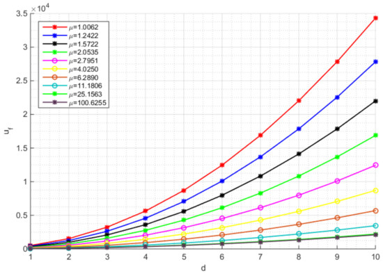 Relationship between and d in different situations for the case .