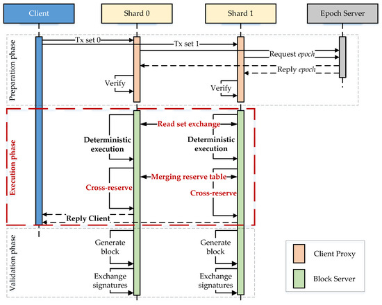 - An example of the transaction of account amalgamating. It is convenient for readers to better understand the entire processing of cross-shard transactions. This is a detailed description of the transaction of account amalgamating as an example. In this example, there are two shards: Shard containing accounts A, B, and C, and Shard containing accounts D and E. As depicted in Figure 5, the transaction set to be sent by the client includes the transaction amalgamate(C, D) and other intrashard transactions. Amalgamate(C, D) is aimed at merging accounts C and D. It comprises four operations, referred to subsequently as Op1−4, which are to obtain the balance of C, obtain the balance of D, update the balance of C to 0, and update the balance of D to the sum of the original balances of C and D. The client divides the complete transaction set into two subtransaction sets and sends them to and Shard , respectively. After the preparation phase, amalgamate(C, D) is assigned to the Epoch N and is also assigned a unique . During the execution phase, the intrashard block server executes this transaction deterministically. It is noteworthy that for cross-shard transactions like amalgamate(C, D), operations are executed based solely on the accounts contained within the local shard. Specifically, executes only and , while executes only and . However, since depends on the read set of , it cannot be executed directly, but if has completed execution and sent the read set to , then it can directly read the prereceived read set from the local cache for executing (according to Algorithm 1). Otherwise, it is temporarily pended and continues to execute other transactions. After the deterministic execution is completed, cross-reserve first generates the intrashard reserve table (according to Algorithm 2, Lines 5–13, the bold words in Figure 5). In this example, reserves the update of C from amalgamate(C, D), while reserves the update of D from the other transaction. After merging reserve tables of cross-reserve (according to Algorithm 2, Lines 14–25), the reserve tables in both shards have the same row of C and D (the gray words in Figure 5). and conduct conflict detection based on the complete reserve table (according to Algorithm 3). According to the deterministic rule, this transaction exists with a WAW dependency. As a result, amalgamate(C, D) ultimately is aborted.