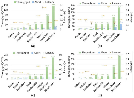 - Setup. We deployed 12 nodes on Aliyun [54] in the same data center. Each node is an ecs.hfc6.4xlarge instance with an Intel Xeon Platinum 8269CY 3.1GHz 16-core processor, 32GB RAM, and 10 Gbps bandwidth. In Fabric, Fabric#, and FastFabric, four nodes are orderers, and eight nodes are peers. Basil requires running on nodes; hence, we deployed Basil on 12 nodes. For ResilientDB, we deployed it on eight nodes. For Meepo, we deployed it on eight nodes. Due to the trustworthiness within the consortium member, each shard can deploy on a single node. In NeuChain+ and NeuChain, each client proxy corresponds to one block server and runs on the same node. We deployed four nodes for epoch servers and eight for client proxies and block servers. By default, NeuChain+ runs on two shards, and each shard is deployed on four nodes of client proxies and block servers.