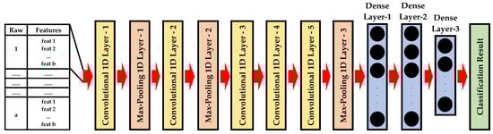 The 1D-AlexNet architecture has a similar design and parameters to the 1D-LeNet previously described. 1D-AlexNet has five convolutional 1D layers and three max-pooling 1D layers for feature extraction then three fully connected layers for classification. It is composed of eight layers with adjustable parameters as shown in Figure 4.