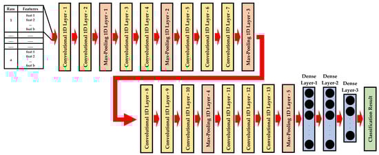 The other convolutional neural network architecture known as VGG16, short for “Visual Geometry Group 16”, was created by the Visual Geometry Group at the University of Oxford [39]. The VGG-16 frame was originally designed for image classification tasks. To build another deep learning architecture for this study, the VGG16 convolutional neural network is modified for the one-dimensional PdM dataset. 1D-VGG16 mainly contains of a total of 13 convolutional 1D layers, 5 max-pooling 1D layers, and 3 fully connected layers as shown in Figure 5.