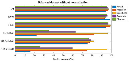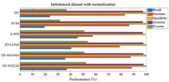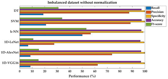 Performance results of the classification with the imbalanced dataset without normalization are given separately in Table 4. For all experiments, the classification performance scores from different types of SML algorithms (DTs, SVMs, and k-NNs) and DL techniques (1D-LeNet, 1D-AlexNet, and 1D-VGG16) are shown in the tables. The overall accuracy values are high in both the shallow and deep machine learning algorithms.