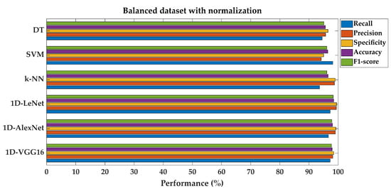 Secondly, for the MF label, the balanced dataset was generated according to Table 3. The same approach as the previous study was performed again on the balanced dataset and performance results are given separately in Table 4. After the normalization process, performance metrics in Table 4 show improvement for most of the SML algorithms and all DL architectures compared to the studies conducted in the first two sections of the experimental results. For instance, DT achieves a recall rate of 94.55% and a precision rate of 95.71% after normalization and balancing of the dataset. Similarly, SVM demonstrates a recall rate of 98.18% and a precision rate of 94.19%. Even the k-NN model, which already showed high performance, sees further improvement with a recall rate of 93.64% and a precision rate of 98.72%. Moreover, as can be seen from Table 4, the highest classification performance values were obtained in DL classification algorithms such as 1D-LeNet, 1D-AlexNet, and 1D-VGG16 using a balanced dataset with feature normalization. These models achieved remarkable recall rates of 97.27%, 96.67%, and 97.27%, respectively. Additionally, they demonstrated the highest precision rates of 99.38%, 99.07%, and 98.17%, highlighting their capacity to accurately classify fault predictions. These high recall and precision rates contributed to increased F1-scores of 98.32%, 97.85%, and 97.72%, reflecting the overall effectiveness of DL models in achieving a balance between precision and recall. Bar graphs which were prepared to visually demonstrate the performance improvement are given below. Figure 8 and Figure 9 compare fault classification performance metrics for both SML and DL models on imbalanced and balanced datasets, each with normalization.