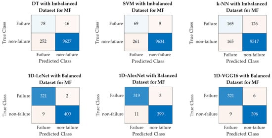 In order to examine the classification performance for a balanced dataset for the machine failure label, we generated a balanced dataset which consisted of 330 rows of machine failure data and 402 rows that were randomly selected from non-failure labeled data in the dataset with 100 different repetitions. In addition to classical machine learning methods such as DTs, SVMs, and k-NNs, three types of deep learning architectures including 1D-LeNet, 1D-AlexNet, and 1D-VGG16 were utilized with 100 different balanced datasets and the maximum classification performance scores are displayed in the Table 4. The classification studies for the MF label were repeated on the balanced dataset without feature normalization.