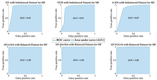 Figure 10 shows the confusion matrices for PdM fault classification using SML and DL models, illustrating the highest classification performance achieved by each model. Additionally, Figure 11 presents the ROC curves and AUC values for SML and DL models, demonstrating the highest classification performance achieved by each model. In future studies, we will apply data augmentation techniques to the original PdM dataset. In addition to binary classification, multi-class classification will be conducted to classify different fault types present in the original PdM dataset, and their performance will be examined. Also, in future studies, one-dimensional predictive maintenance data will be transformed into two-dimensional images and fault classification will be performed on these images using different deep learning algorithms.